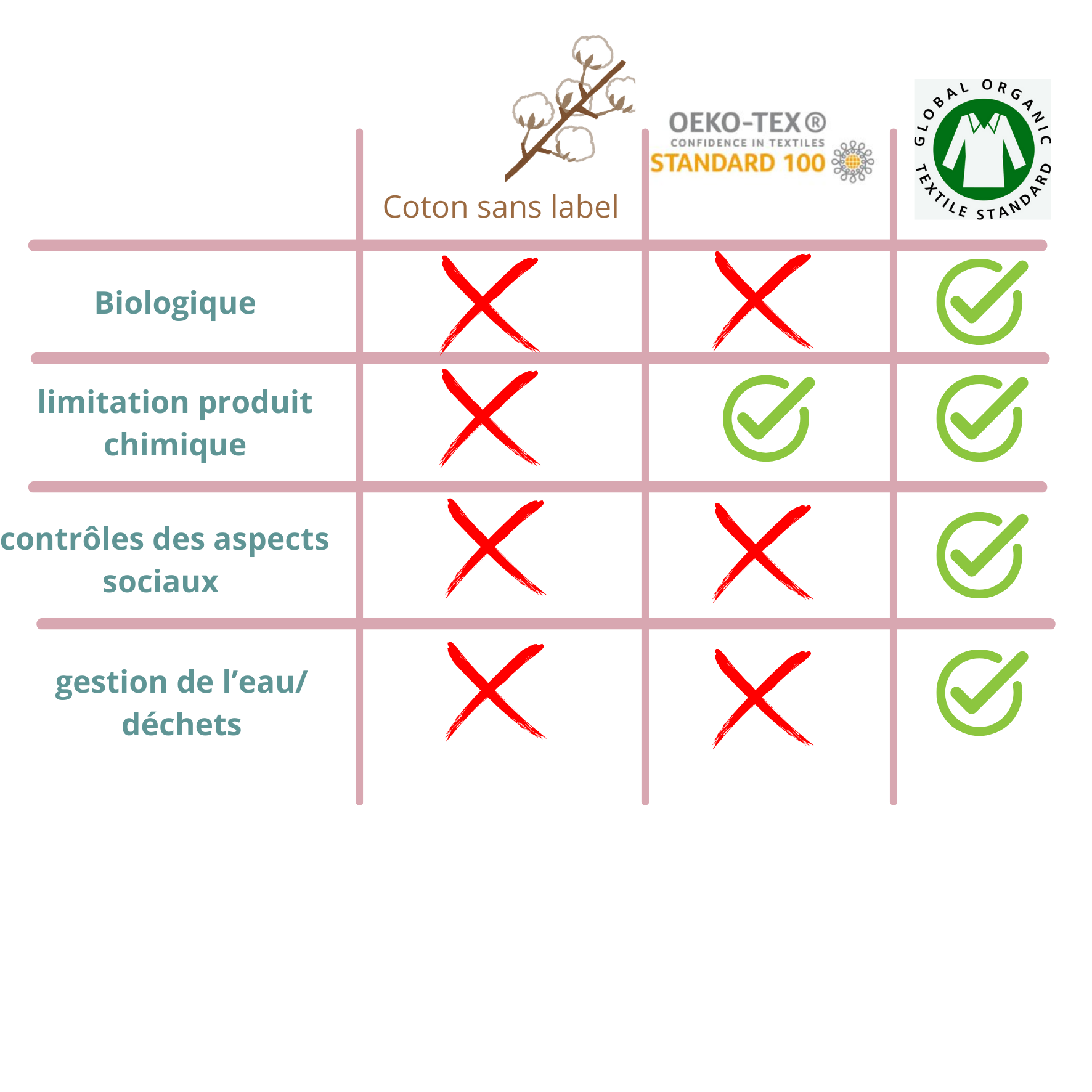 Il certifie que le tissu, qu’il soit ou non biologique, ne contient aucune substance nocive pour la santé. C’est une garantie de sécurité, particulièrement importante pour les produits destinés aux enfants.